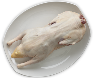 將全鴨自肩胛骨關節窩卸下,去除胸椎及肋骨,並由上半身自胸椎和腸骨接合處切斷,鴨翅部位在翅膀上腕骨處敲斷切開,取得上半身部位之清肉稱謂之